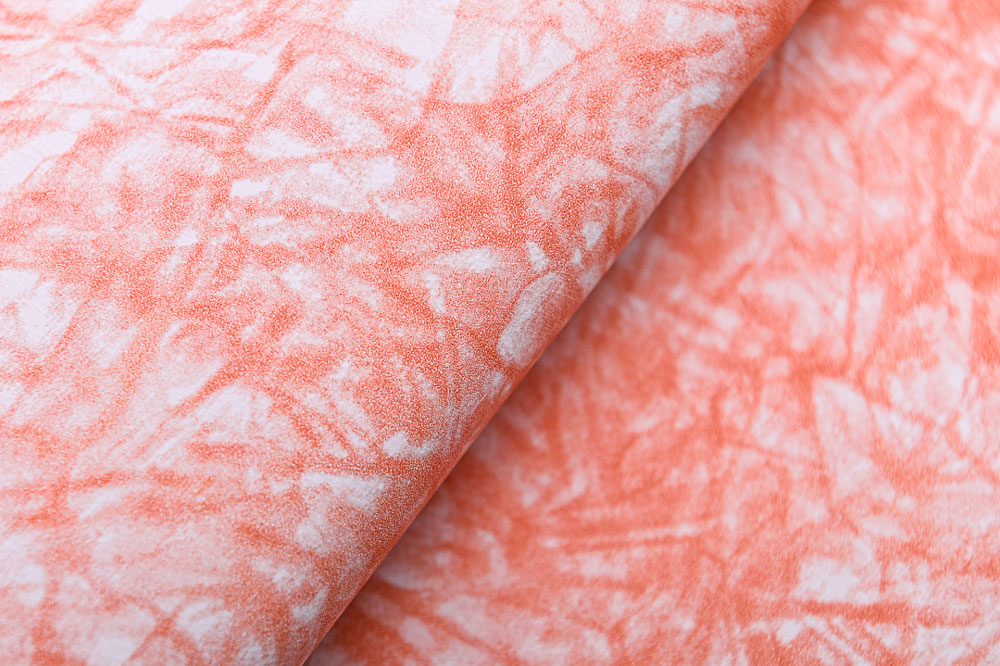 Full grain milled leather, performance, with tye-dye design. The two-tone combination of this pattern on white base provides a washed aesthetic. Very soft temper and addictive surface feel. Vulcanizable. Washable.